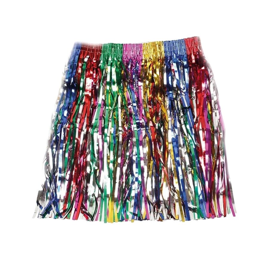 Saia listrada colorida, com 40 cm, perfeita para fantasias de Carnaval e festas tropicais, trazendo conforto e estilo para dançar e curtir.