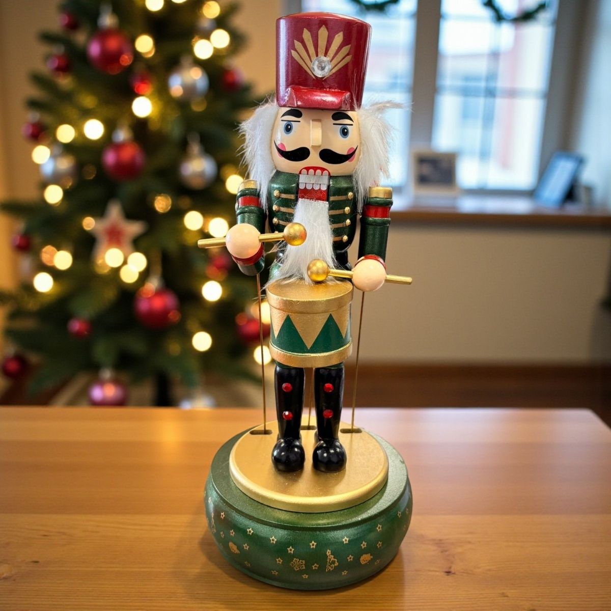 O mecanismo é de corda, localizado discretamente na parte inferior da base — basta girá-lo para que o soldado comece a tocar e se mover. Seu sistema não precisa de pilhas, tornando o uso simples e prático. Com seus 32cm, é uma peça que se destaca com facilidade, servindo tanto para decorações grandes quanto para ambientes menores que precisam de um toque natalino elegante.