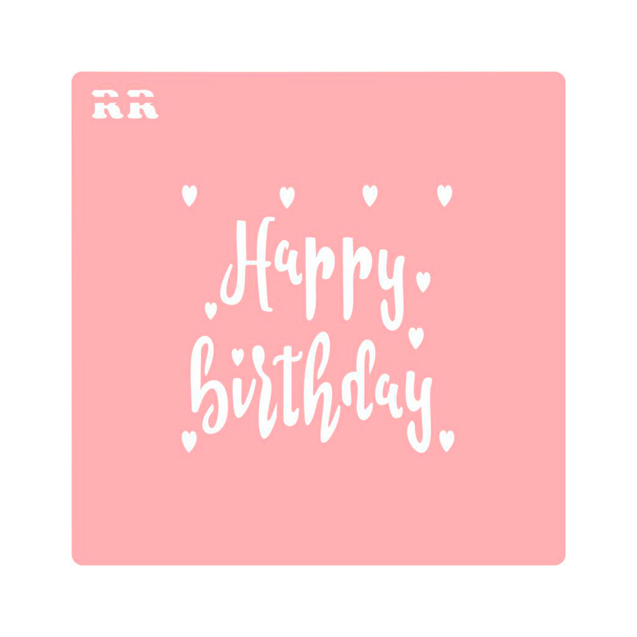 Estêncil em poliéster leitoso com a mensagem "Happy Birthday" salpicado com corações ao redor
