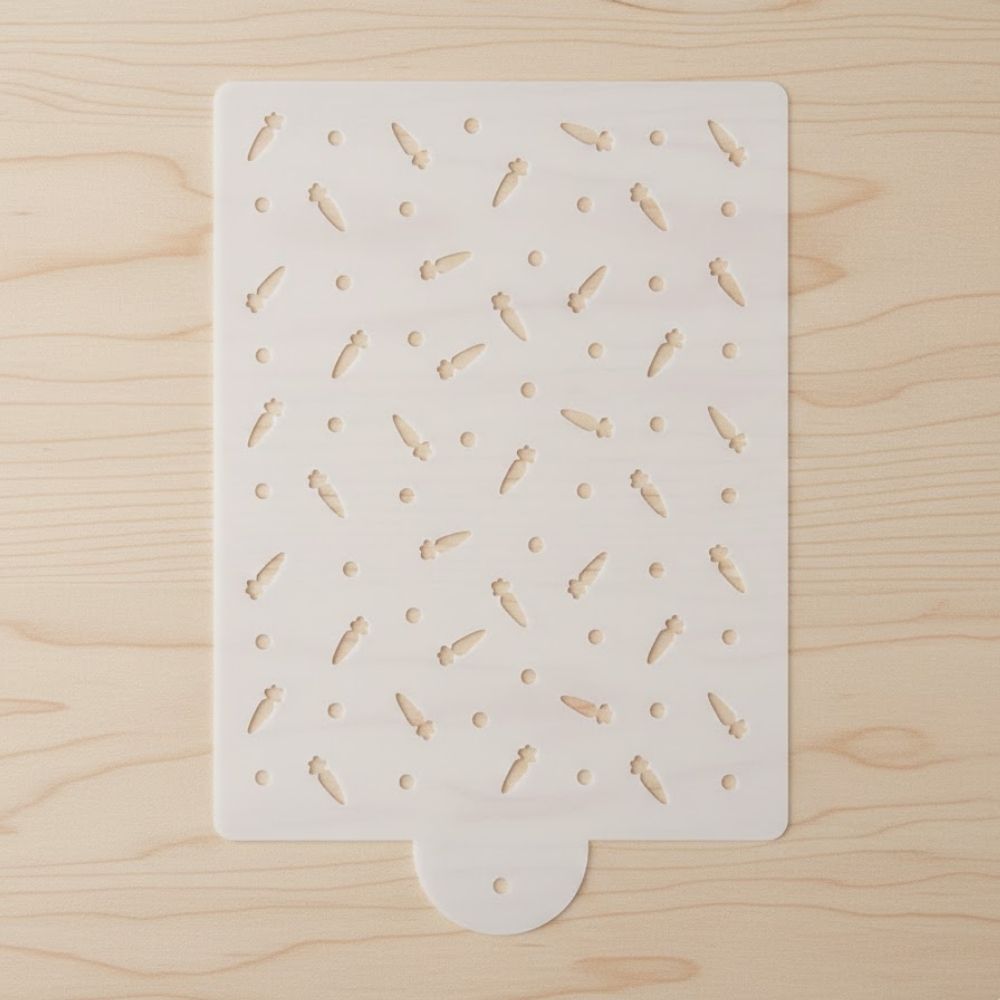 Criativo e versátil, o stencil de Páscoa Cenourinhas é ideal para personalizar doces, embalagens e peças decorativas com praticidade e acabamento profissional. Com delicadas cenourinhas vazadas, ele permite criar composições temáticas encantadoras, trazendo o clima alegre e lúdico da Páscoa para diferentes superfícies.