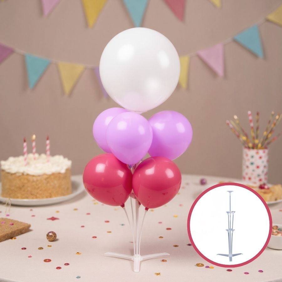 O uso é simples e rápido: basta inflar o balão bubble, fixar sua extremidade no encaixe do copo/haste, posicionar na base e o suporte já estará pronto para ser utilizado. Esse sistema evita que o balão se solte ou tombe, mantendo o arranjo firme durante toda a festa. Por ser reutilizável e fabricado em plástico de alta resistência, o suporte pode ser usado diversas vezes, suportando diferentes tamanhos de balões bubble (recomendado de 18 a 24 polegadas). Além disso, seu formato compacto permite combinar com fitas, laços, adesivos ou outros elementos decorativos, criando produções personalizadas e sofisticadas.