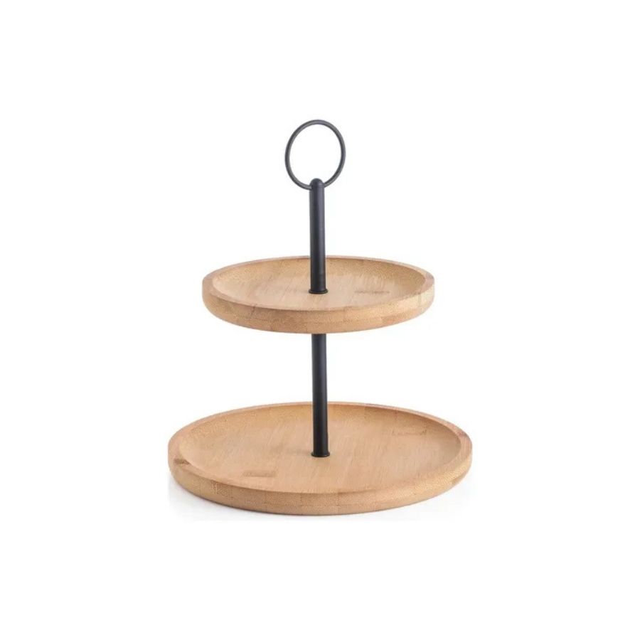 Suporte para doces com 2 andares feito em bambu, medindo 20x23,5cm. Ideal para servir petiscos, doces ou expor produtos artesanais com estilo natural e refinado.