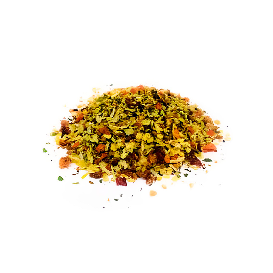 Cebola desidratada, Alho desidratado, Cenoura, sal, tomate em flocos, pimentão vermelho em flocos, Mostarda em grãos, colorau especial, óleo de soja, salsa desidratada, cebolinha, farinha de milho e fosfato tricálcico.
