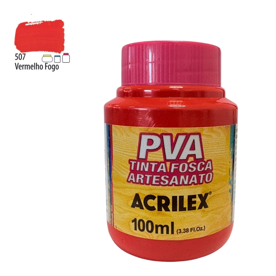 A Tinta Fosca para Artesanato PVA Acrilex é à base de látex P.V.A., pronta para uso, com secagem rápida e acabamento fosco, ideal para uma variedade de técnicas artesanais. Pode ser aplicada com pincel, esponja ou rolinho de espuma, garantindo excelente cobertura e uniformidade. Indicada para superfícies como madeira, MDF, gesso, cerâmica, cortiça, isopor, papel, palha e PET, sendo que materiais como o PET devem ser previamente preparados com Primer Acrilex.