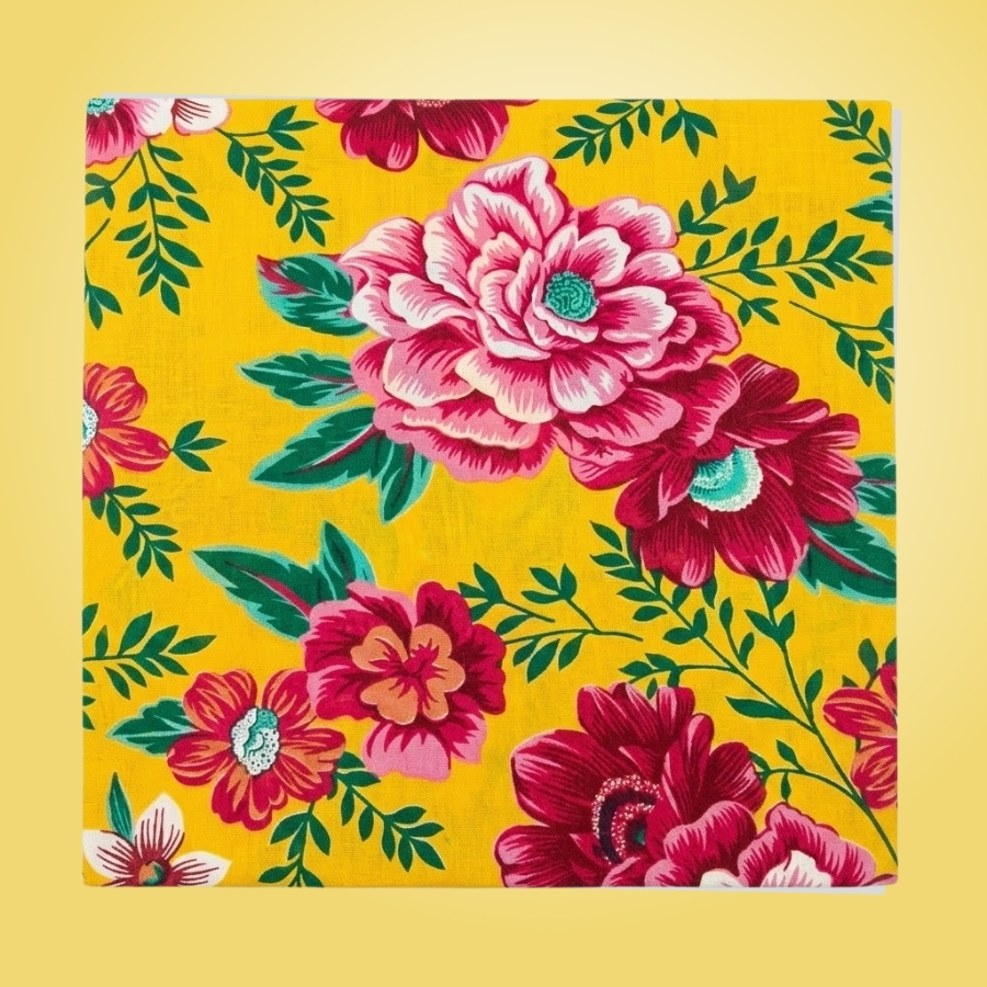 Toalha confeccionada em tecido tipo chita, com estampa amarela e flores vermelhas. Possui dimensões aproximadas de 70cm de largura e 70cm de comprimento. Indicada para uso decorativo e proteção de superfícies. Por se tratar de material têxtil, pode apresentar variações de tonalidade e estampa. Recomenda-se evitar contato com umidade excessiva e realizar limpeza adequada para preservar o tecido.