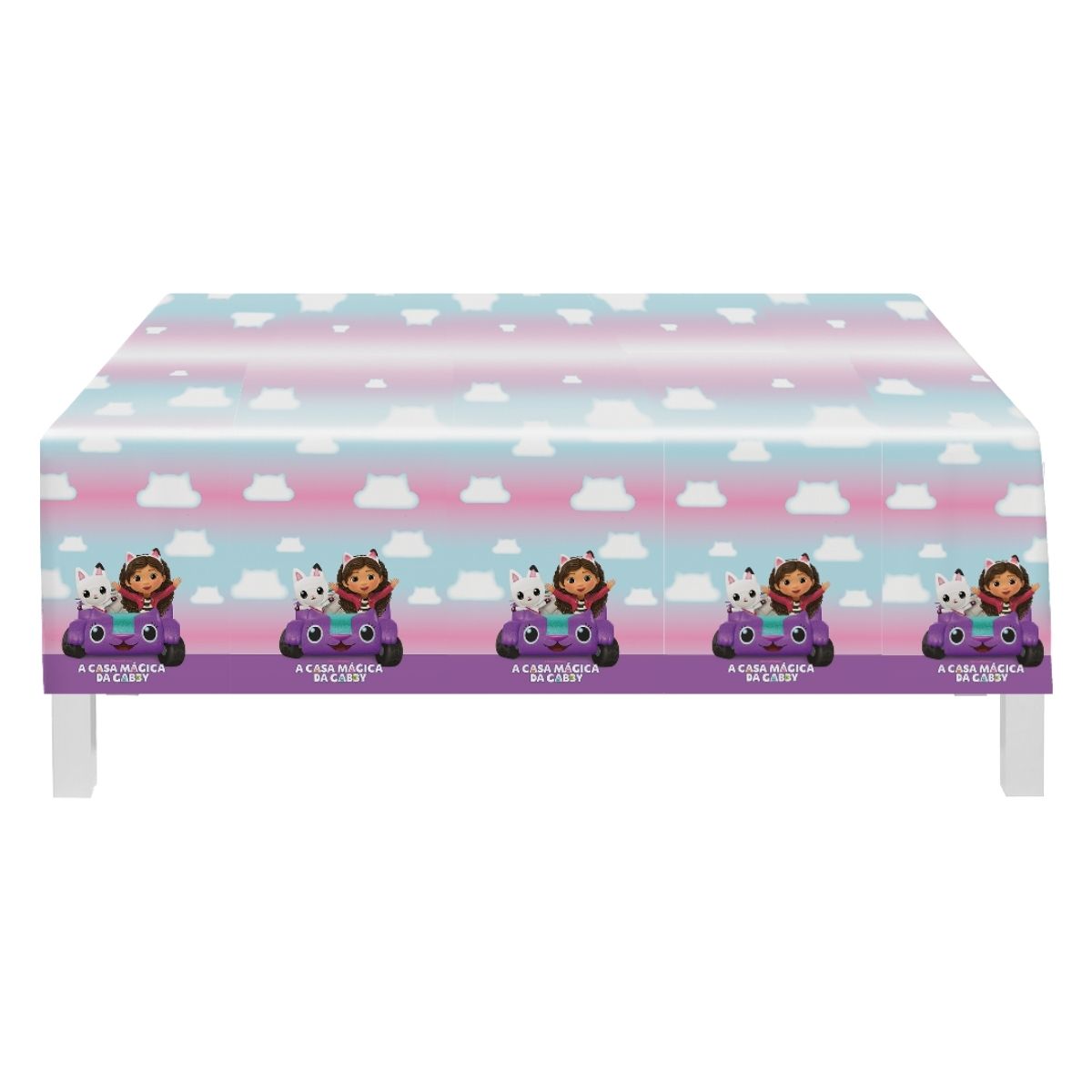 Estenda a toalha sobre a mesa principal ou mesa de apoio. Complete com pratos, copos, enfeites e itens do tema A Casa Mágica da Gabby para criar uma composição ainda mais encantadora.