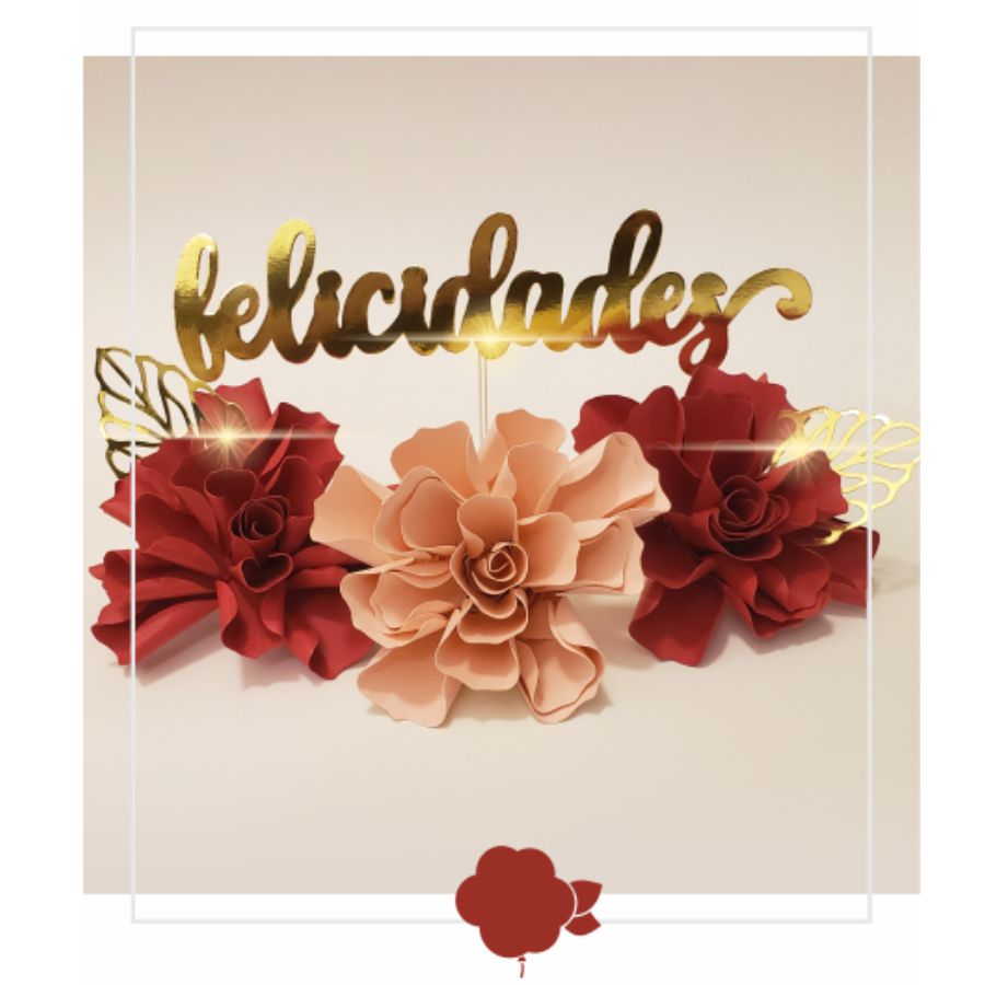 A Amora Festa em Papel possui o topo de bolo perfeito para a sua festa! Este modelo contém uma peça escrita “Felicidades”, já com aplicação de canudo transparente, que é resistente e fácil de ser aplicado no bolo, além de 2 folhas vazadas cortadas delicadamente em papel metalizado dourado.