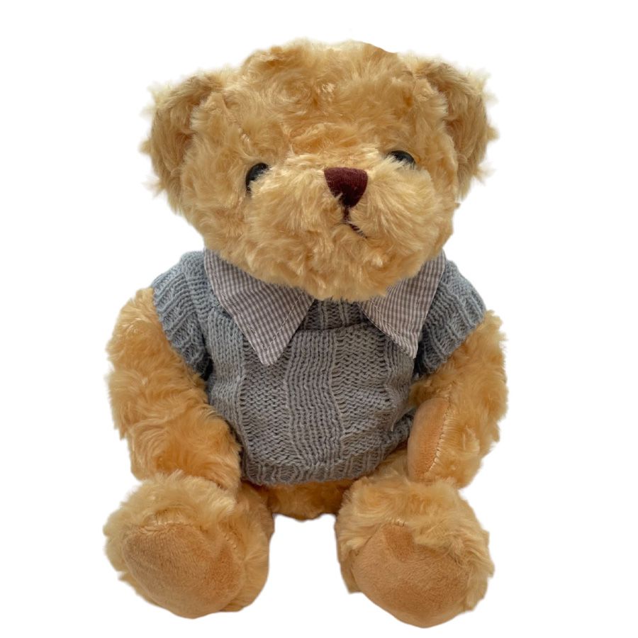 Urso de Pelúcia Bege, com blusa de lã a cor azul, com detalhe de gola listrada