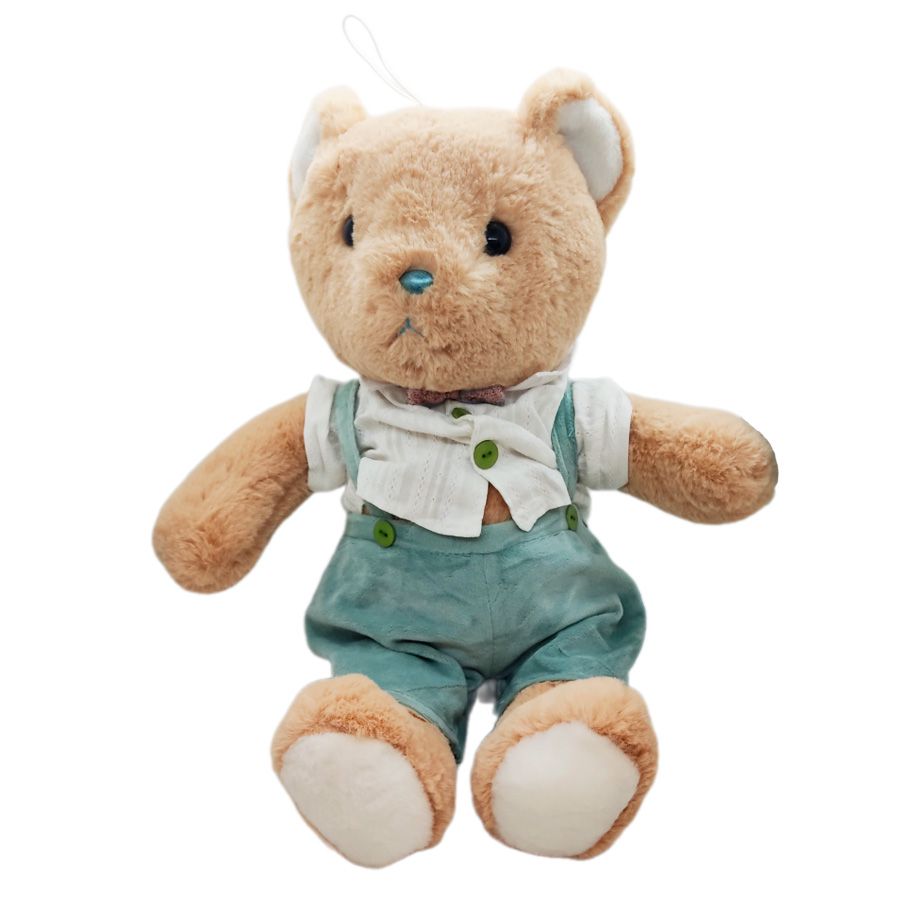 Urso de pelúcia na cor bege com jardineira na cor verde com camisa branca