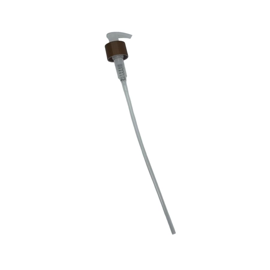 Válvula pump plástica marrom para frascos com rosca 28/410, ideal para frascos de 100ml a 250ml. Vem com tubo pescante de 26,5 cm. Acabamento funcional e resistente para cremes, sabonetes líquidos, shampoos e condicionadores.