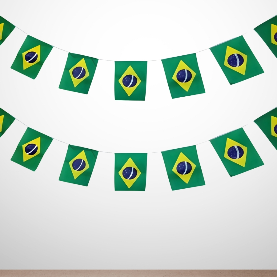 O Varal Bandeira do Brasil - 4,5m é um item decorativo composto por várias bandeiras do Brasil fixadas em um fio. É utilizado para ambientação temática em festas, eventos esportivos e datas comemorativas.