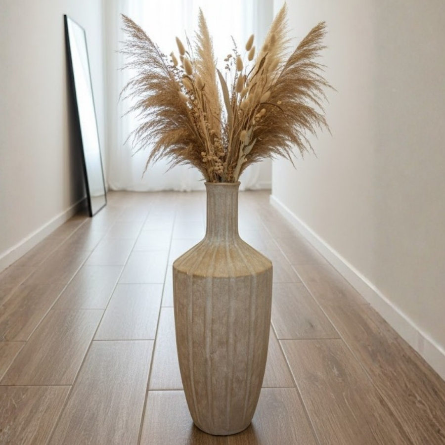 Produzido em cerâmica de alta qualidade, o vaso oferece resistência e um acabamento cuidadoso. Pode ser utilizado no chão ou ao lado de móveis, com galhos decorativos, flores secas ou como peça ornamental única. Versátil e sofisticado, contribui para composições equilibradas, trazendo altura, presença e harmonia ao ambiente.