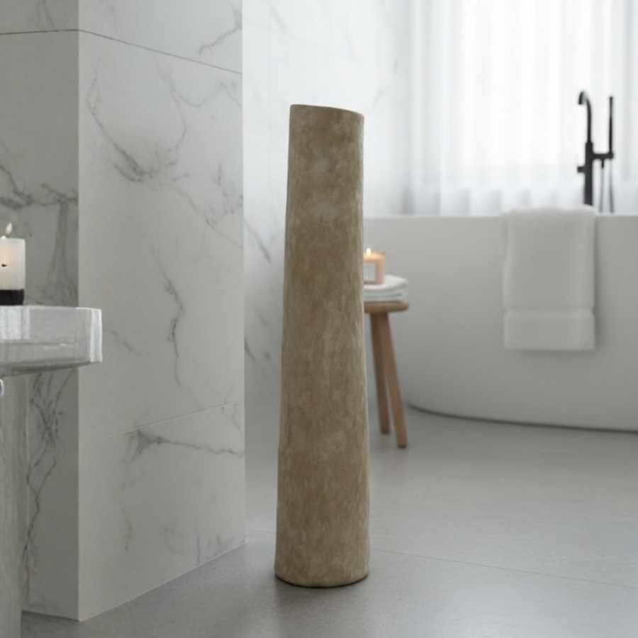 O vaso decorativo em cerâmica é uma peça sofisticada e imponente, ideal para criar um ponto de destaque elegante na decoração. Com dimensões de 77x17x17cm, possui formato cilíndrico e proporção alongada, valorizando a verticalidade do ambiente. Seu acabamento dourado levemente cintilante confere um toque de luxo sutil e refinado, perfeito para composições contemporâneas e modernas dentro do conceito de home decor.