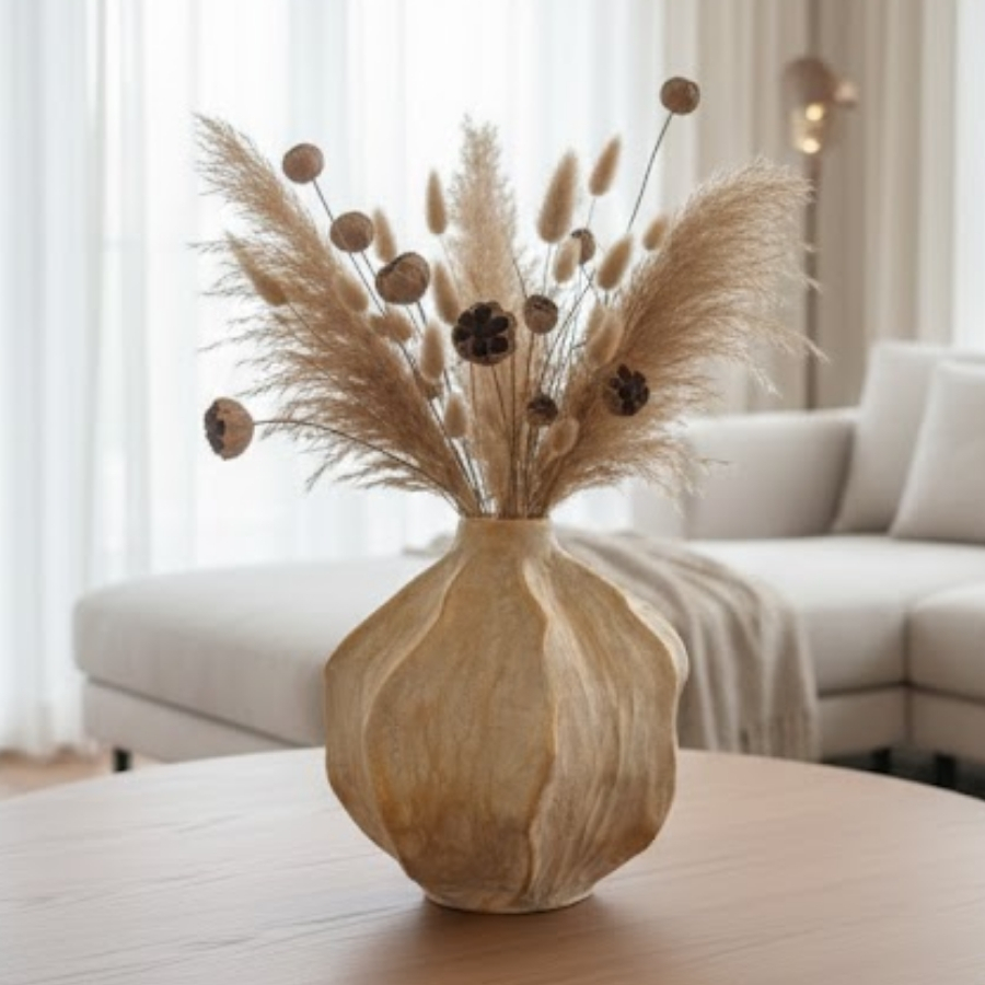 A silhueta arredondada, com base bem apoiada e abertura superior mais estreita, faz com que o vaso tenha presença e impacto na decoração. É uma peça ideal para ambientes contemporâneos, rústicos ou com proposta mais artística, funcionando como ponto focal em aparadores, mesas ou estantes, mesmo quando utilizado sem arranjos.