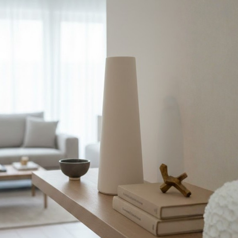 Produzido em cerâmica, o vaso possui textura sutil e aparência artesanal, tornando-se ideal para composições de home decor com estilo natural, orgânico ou contemporâneo. Pode ser utilizado como peça decorativa isolada ou com flores secas e galhos decorativos, funcionando como elemento de destaque em mesas, aparadores ou prateleiras.