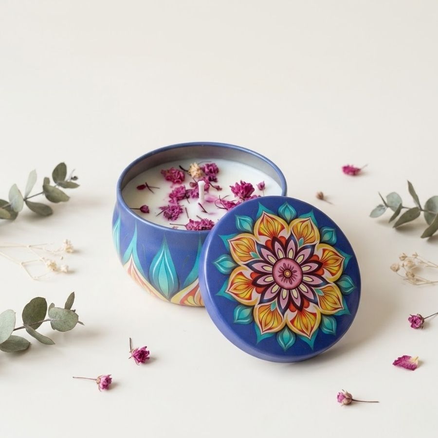 Vela com essência floral em lata de metal com estampa de flores e mandalas para fins decorativos, presentes de dia das mães e/ou dia dos namorados. Obs.: A essência da vela possui fragrância suave e pode variar, não sendo possível escolher.