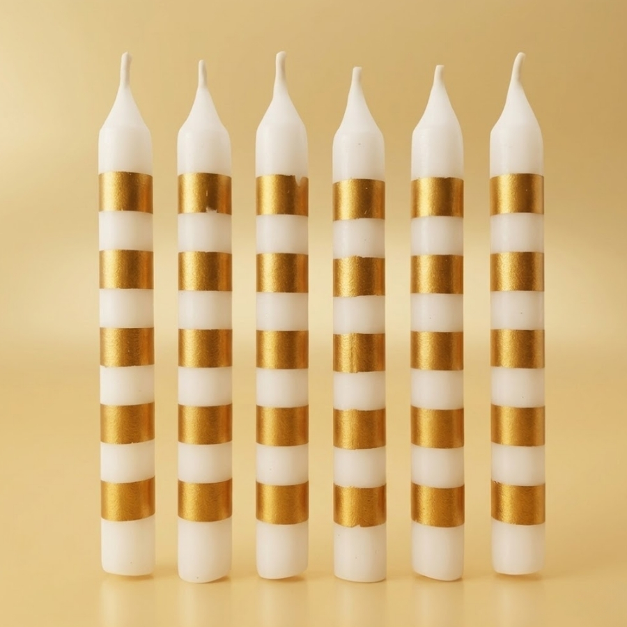 Vela decorativa para bolo no formato palito, nas cores branco e ouro, com altura aproximada de 8cm. Indicada para uso em bolos de aniversário ou composições decorativas em festas e comemorações. Produto destinado ao uso durante celebrações. Recomenda-se posicionar a vela em superfície estável antes de acender, manter afastada de materiais inflamáveis e utilizar sob supervisão de um adulto.