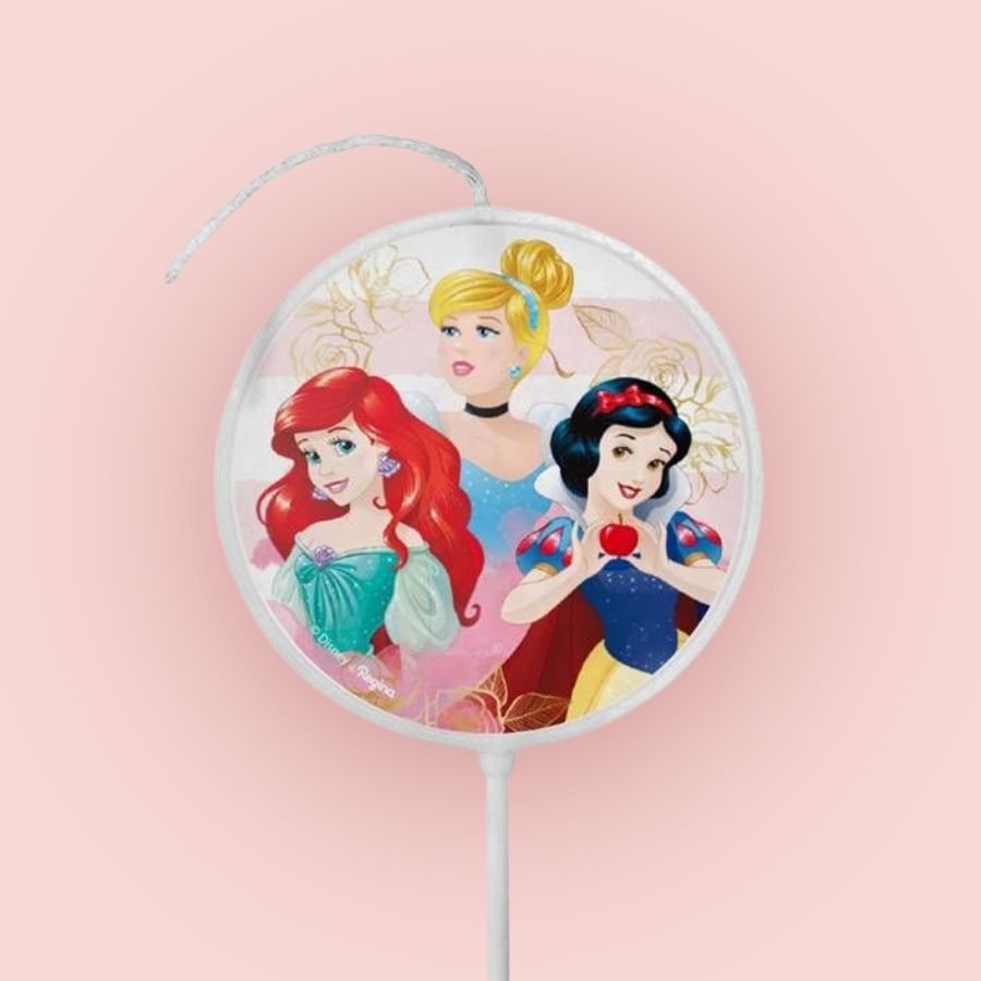 Vela plana adesivada com suporte tipo pick e estampa das Princesas da Disney, ideal para decorar bolos de aniversário em festas infantis temáticas, trazendo charme, praticidade e um visual encantador.