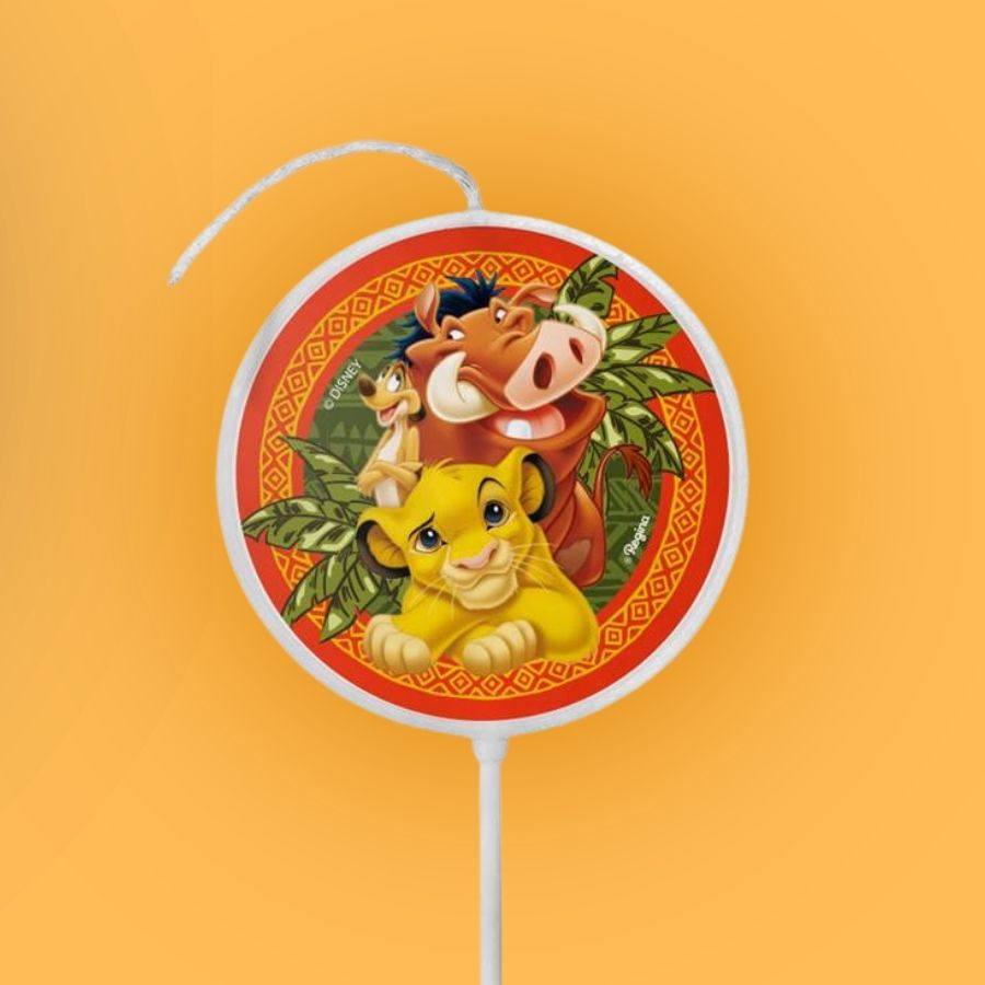 Vela plana adesivada com suporte tipo pick e estampa do Rei Leão, ideal para decorar bolos de aniversário em festas infantis temáticas com praticidade e um visual divertido.