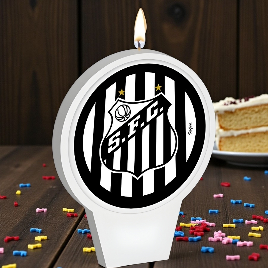 Vela plana com tema Santos, dimensões 7x8,5cm. Leve, prática e segura, ideal para decorar bolos, mesas e festas temáticas de torcedores.
